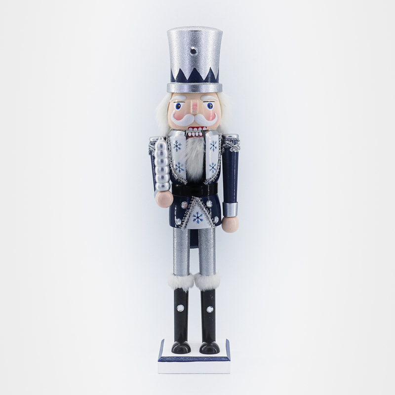 DREVENÝ LUSKÁČIK S KLOBÚKOM, MODRÉ A BIELE STRIEBORNÉ TRBLIETKY
