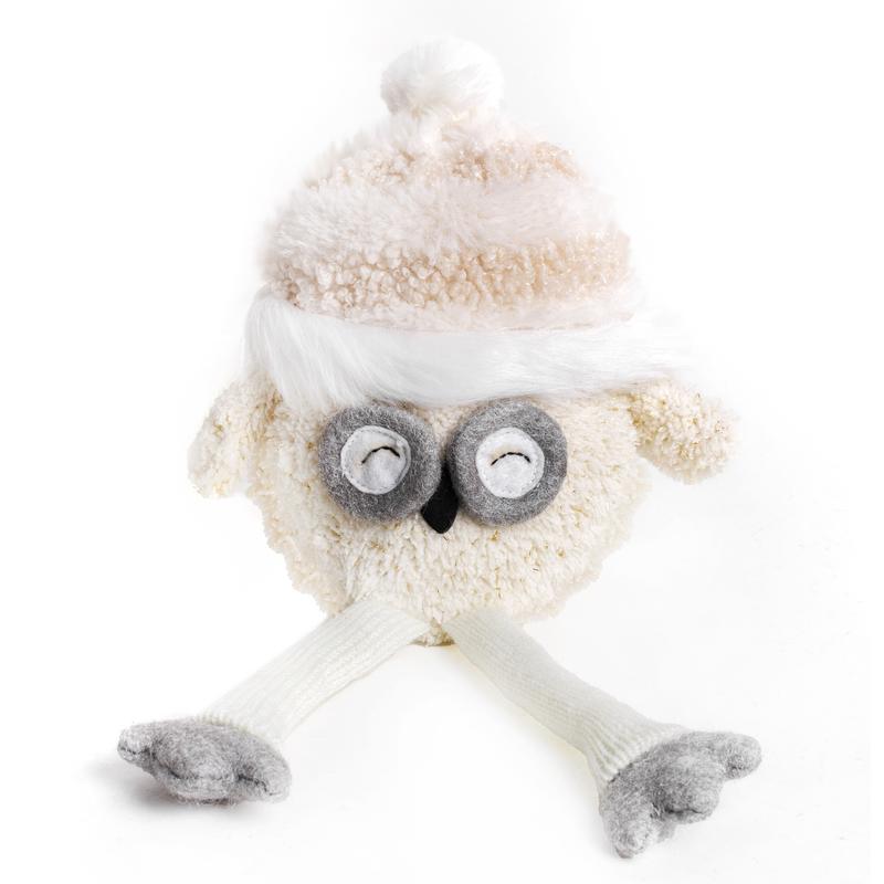 TEXTILNÁ SNEHOVÁ SOVA SO ZAVESENÝMI NOHAMI, V ČIAPKE, BIELA