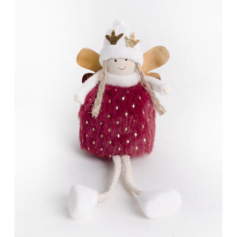 • TEXTILNÝ ANJEL SO ZAVESENÝMI NOHAMI, ČIAPKA S PAROŽÍM VO VÍNOVEJ A BIELEJ FARBE