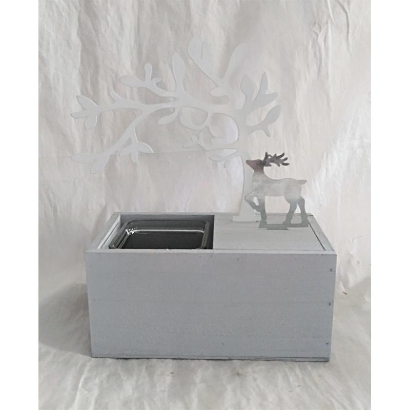 • DREVENÁ ŠKATUĽA SO SKLENENÝM SVIETNIKOM, KOVOVÝM STROMČEKOM A ROHOM, SIVÁ
