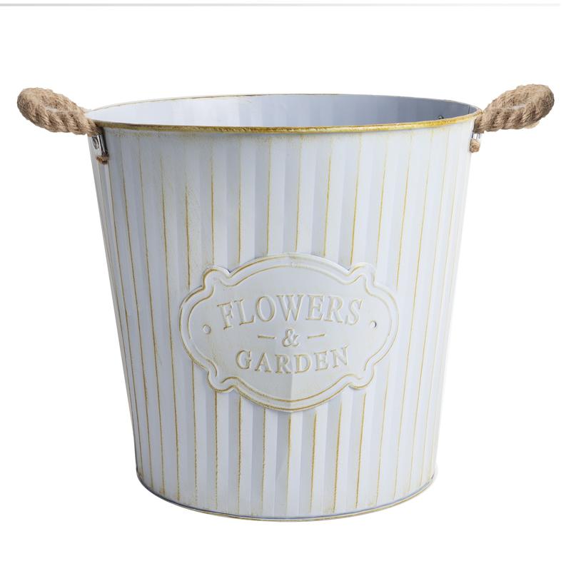PLECHOVÝ KVETINÁČ S NÁPISOM "FLOWERS&GARDEN", LANO S UCHOM, SVETLOMODRÝ
