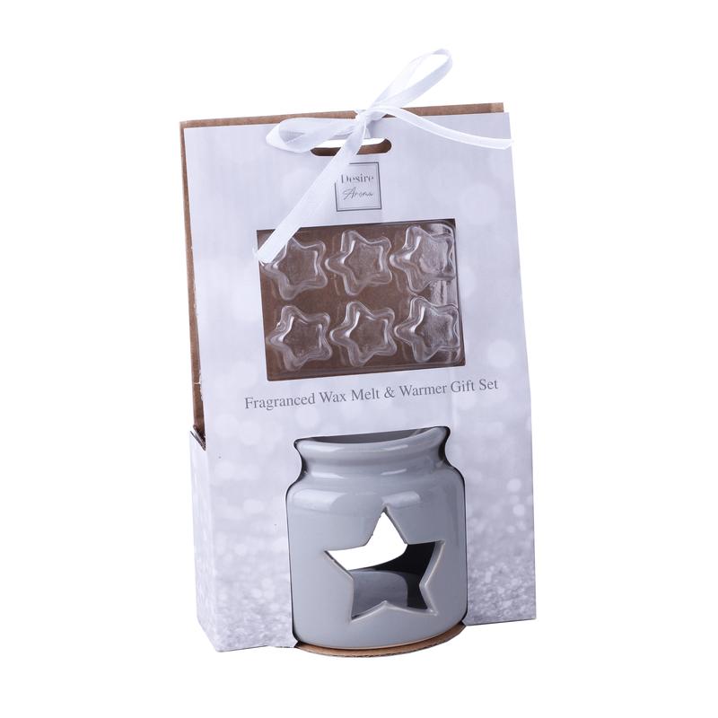 KERAMICKÝ OLEJ NA UMÝVANIE SO 6 VÔŇAMI VOSKU V DARČEKOVEJ ŠKATUĽKE, AŽUROVÝ HVIEZDICOVÝ VZOR, SIVÝ
