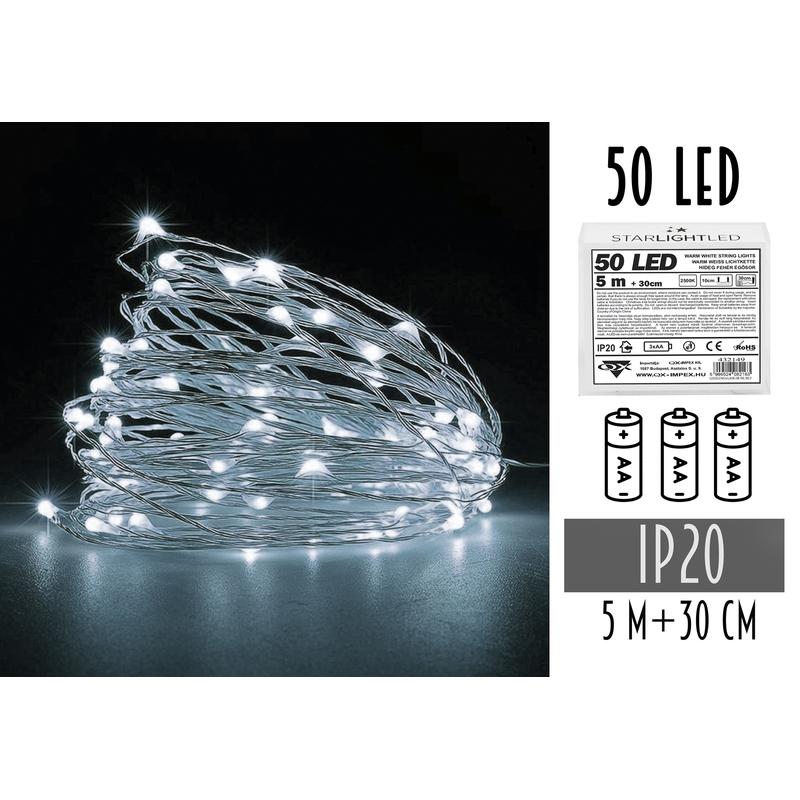 BATÉRIOVÝ DRÔTOVÝ REŤAZEC 3AA, 50 LED, STUDENÁ BIELA, BEZ BATÉRIÍ