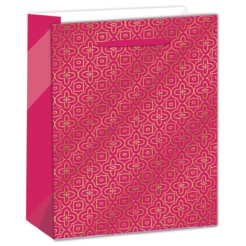 PAPIEROVÁ TAŠKA S MATNOU, HOLOGRAFICKOU ZLATOU POTLAČOU, ZLATÝ MOZAIKOVÝ VZOR NA RUŽOVOM POZADÍ