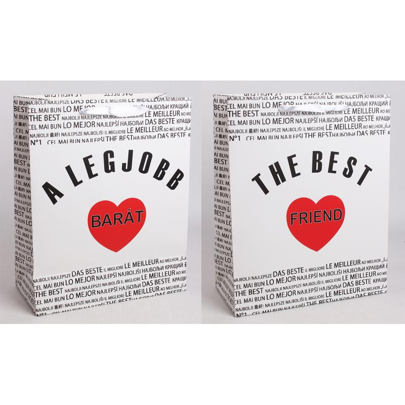 • PAPIEROVÁ TAŠKA S MATNOU KLOPOU SO STUHOU, ČIERNY MEDZINÁRODNÝ NÁPIS NA BIELOM POZADÍ, "A LEGJOBB BARÁT/ THE BEST FRIEND" S ČERVENÝM SRDCOM