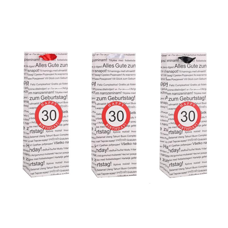PAPIEROVÁ TAŠKA S VÍNOM, MATNÁ, S CHLOPŇOU SO STUHOU, ČIERNA NA BIELOM POZADÍ, S NÁPISOM "HAPPY BIRTHDAY" V NIEKOĽKÝCH MEDZINÁRODNÝCH JAZYKOCH NA POZADÍ, ČERVENÝ KRÚŽOK S ROKOM "30"