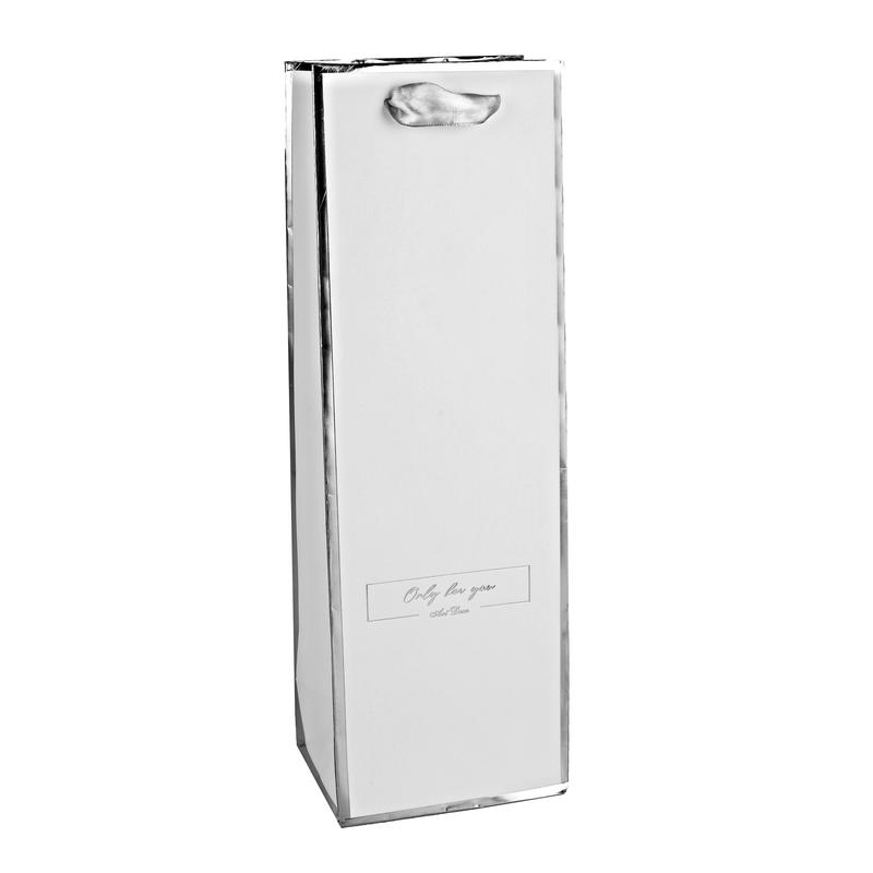 • PAPIEROVÁ TAŠKA S VÍNOM, MATNÁ, STRIEBORNÁ POTLAČ, STUŽKA, STRIEBORNÝ OBRYS NA BIELOM POZADÍ, S NÁPISOM LEN PRE TEBA