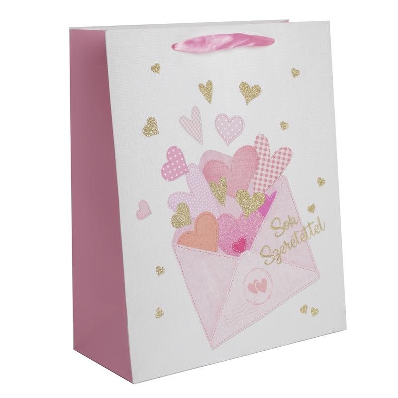 PAPIEROVÉ TAŠKY S MATNÝM, TRBLIETAVÝM NÁPISOM "SOK SZERETETTEL", OBÁLKOU A SRDIEČKAMI