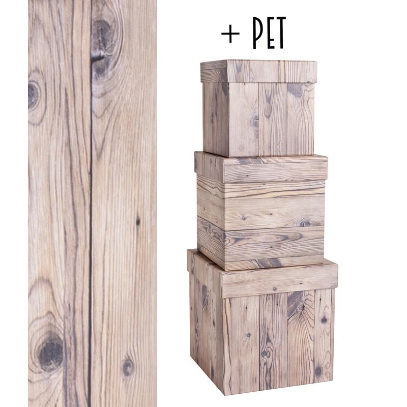 SADA PAPIEROVÝCH KRABÍC S PLASTOVOU VLOŽKOU, 3 KUSY, ŠTVORCOVÁ, BOROVICOVÁ DOSKA