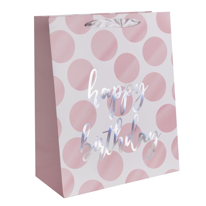 • PAPIEROVÁ TAŠKA MATNÁ, STRIEBORNÁ HOLOGRAFICKÁ S LESKLOU POTLAČOU, "HAPPY BIRTHDAY" S RUŽOVÝMI BODKAMI