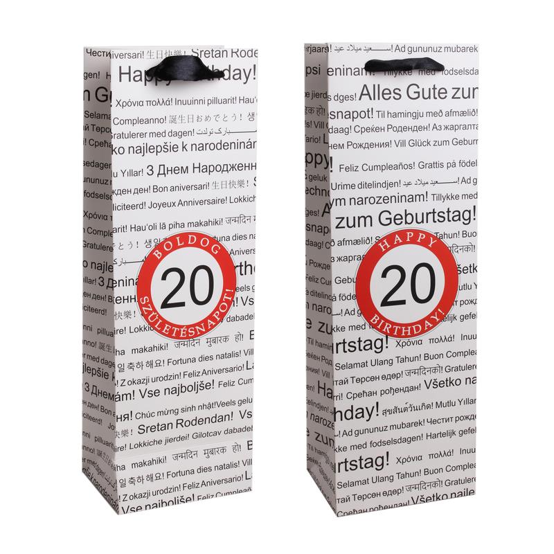 PAPIEROVÁ TAŠKA S VÍNOM, MATNÁ, S CHLOPŇOU SO STUHOU, ČIERNA NA BIELOM POZADÍ, S NÁPISOM "HAPPY BIRTHDAY" V NIEKOĽKÝCH MEDZINÁRODNÝCH JAZYKOCH NA POZADÍ, ČERVENÝ KRÚŽOK S ROKOM "20"